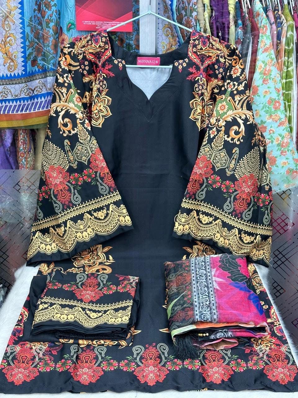Gorgeous black soft silk kameez set featuring intricate white and mauve prints with a floral printed dupatta for a soft, stylish look.