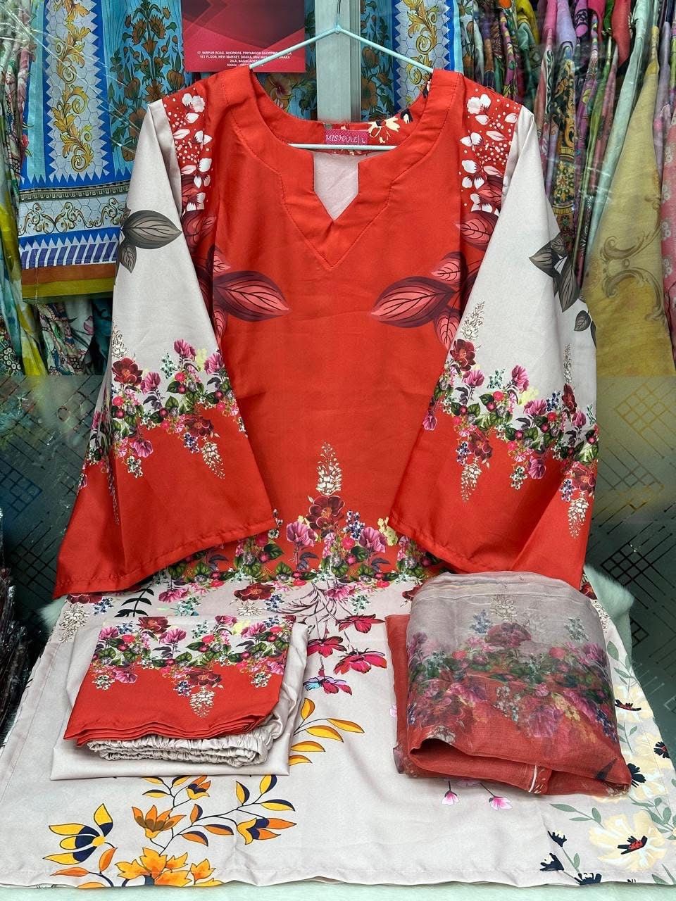 Vibrante dark orange soft silk outfit featuring a floral-printed orna, kameez, and pants.