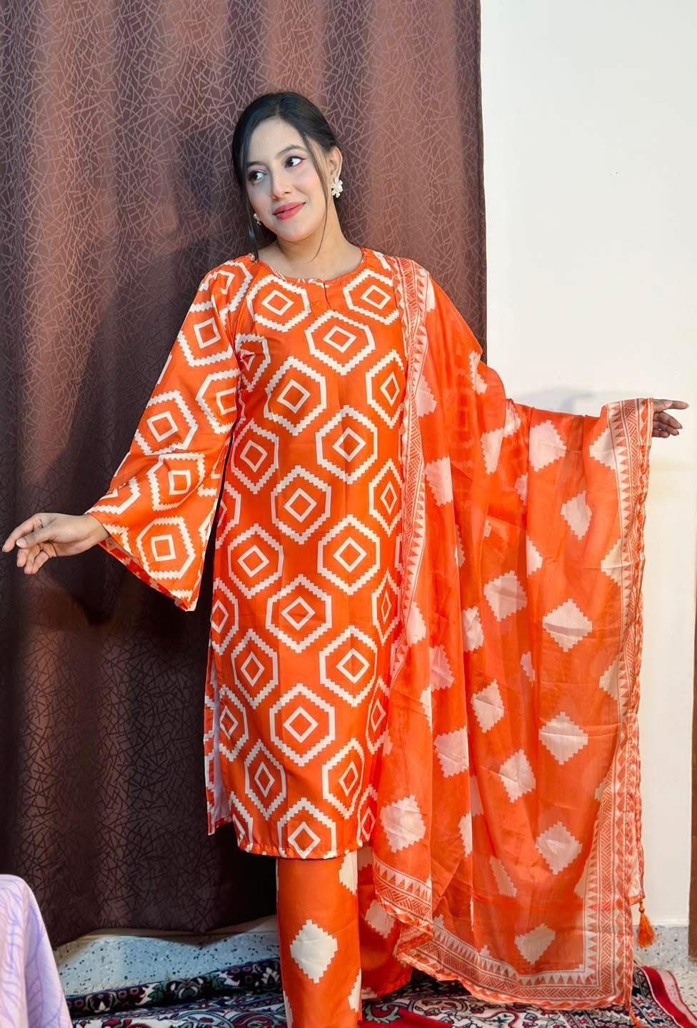 Orange color dubai soft silk kameez set featuring a bold geometric print and matching dupatta for a graceful, festive look.