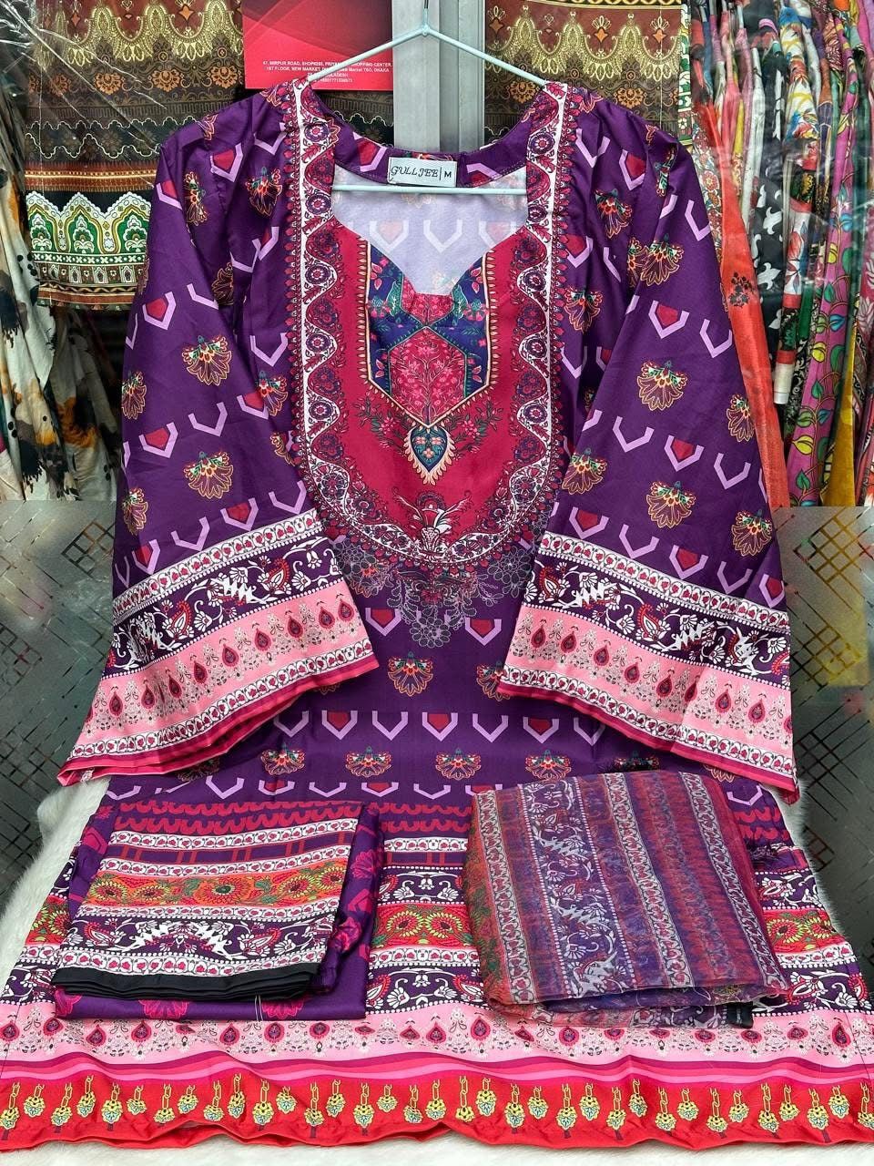 Charming purple silk set with floral print, featuring a kameez, pants, and matching orna.