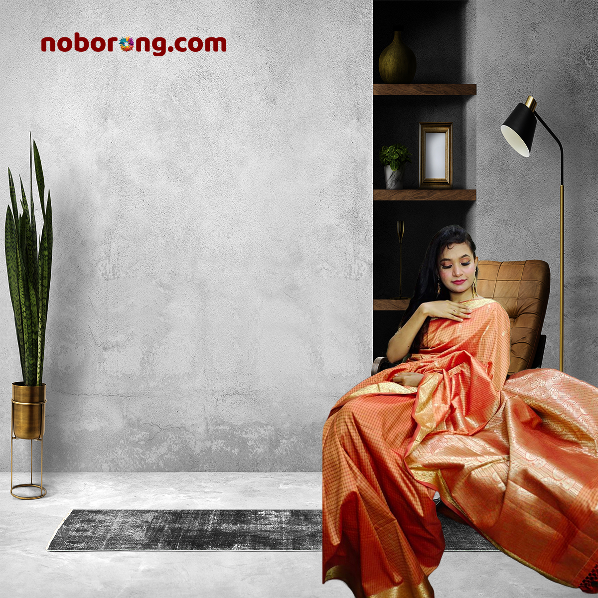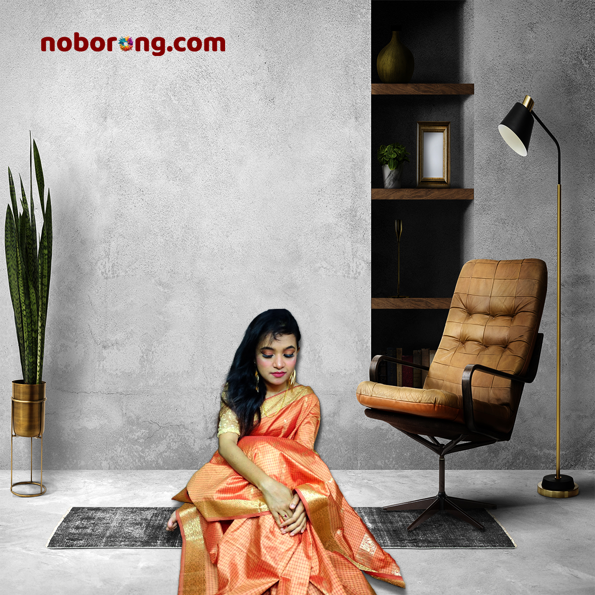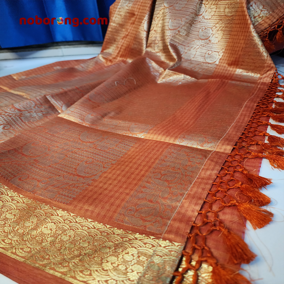 This is a light orange saree with golden thread work in the middle. The body has a subtle textured pattern, and the entire fabric is adorned with check prints. The border has an all-over golden design as well. Tassels are attached to the pallu, and it comes with a matching blouse piece.