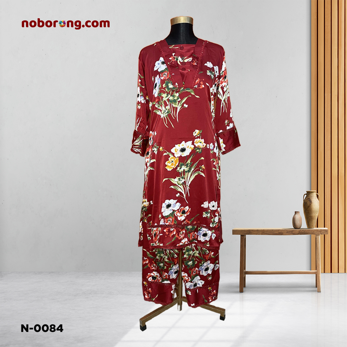 Introducing our stylish floral printed silk co-ords set. This red outfit is crafted from silk fabric. The neck and sleeves are adorned with same colour lace. The V neck is complemented by lace and show buttons. The luxurious silk trousers are adorned with lace too, making the set perfect for any occasion, especially ideal for office, university, or hang out.